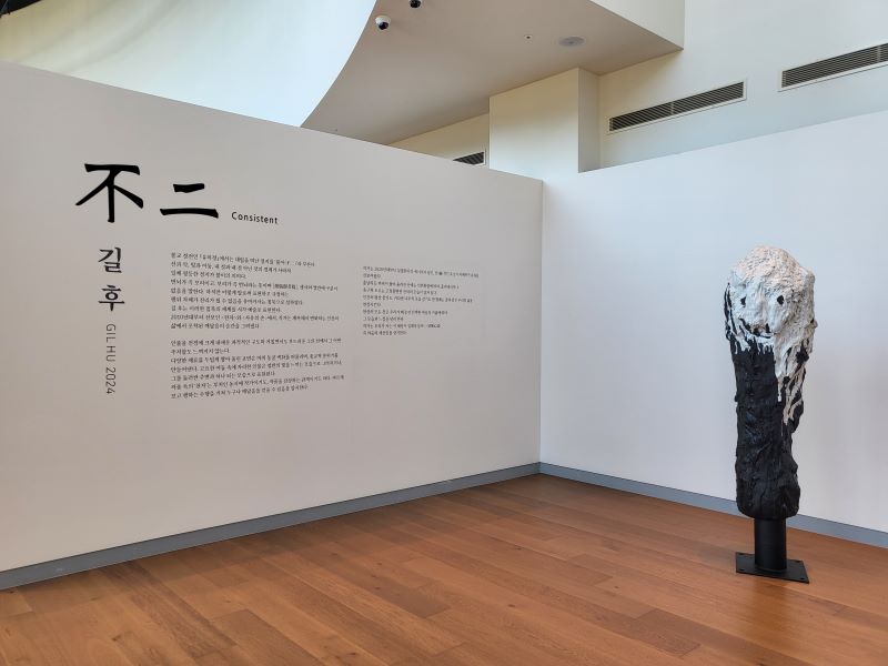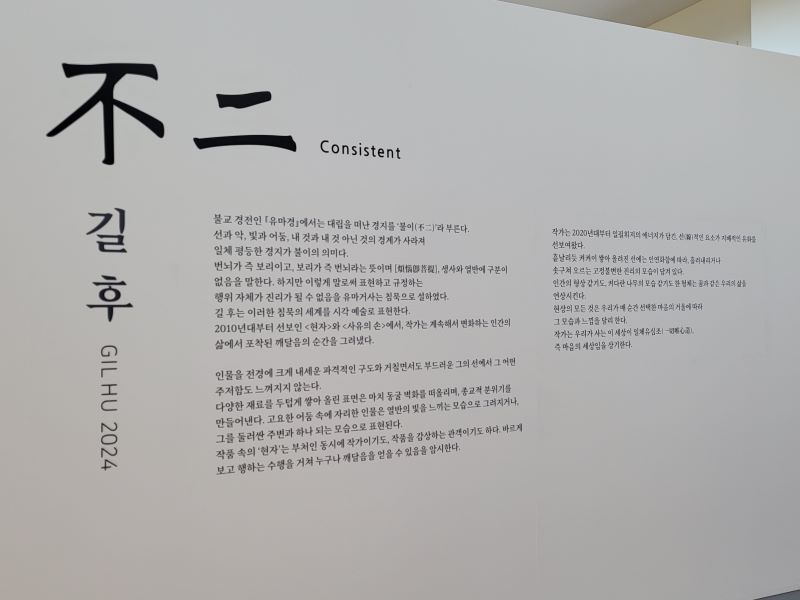 길후 작가는 2010년대부터 선보인 <현자>와 <사유의 손>에서 계속해서 변화하는 인간의 삶에서 포착된 깨달음의 순간을 그려냈다. 인물을 전경에 크게 내세운 파격적인 구도와 거칠면서도 부드러운 그의 선에서 그 어떤 주저함도 느껴지지 않는다. 다양한 재료를 두텁게 쌓아 올린 표면은 마치 동굴 벽화를 떠올리며, 종교적 분위기를 만들어낸다. 고요한 어둠 속에 자리한 인물은 열반의 빛을 느끼는 모습으로 그려지거나, 그를 둘러싼 주변과 하나 되는 모습으로 표현된다. 작품 속의 '현자'는 부처인 동시에 작가이기도, 작품을 감상하는 관객이기도 하다. 바르게 보고 행하는 수행을 거쳐 누구나 깨달음을 얻을 수 있음을 암시한다. 작가는 2020년대부터 일필휘지의 에너지가 담긴,선(線)적인 요소가 지배적인 유화를 선보여왔다. 흩날리듯 켜켜이 쌓아 올려진 선에는 인연화합에 따라, 흘러내리거나 솟구쳐 오르는 고정불변한 진리의 모습이 담겨 있다. 인간의 형상 같기도, 커다란 나무의 모습 같기도 한 형체는 꿈과 같은 우리의 삶을 연상시킨다. 현상의 모든 것은 우리가 매 순간 선택한 마음의 거울에 따라 그 모습과 느낌을 달리 한다. 작가는 우리가 사는 이 세상이 일체유심조 ( 一切唯心造), 즉 마음의 세상임을 상기한다.