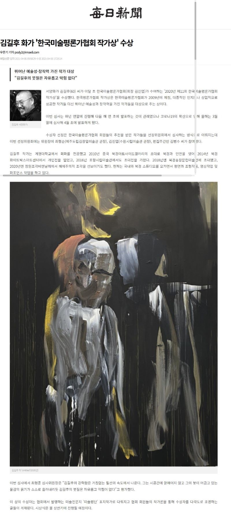 | [2021.04.06] 2021 김길후 화가 '한국미술평론가협회 작가상' 수상 - 매일신문 |