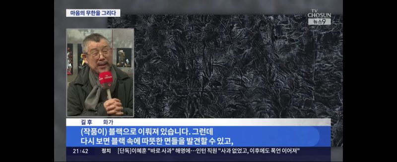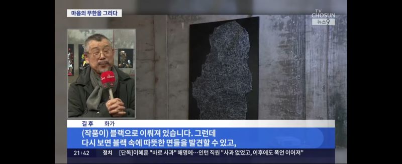 길 후 / 화가 "제 작품이 블랙으로 이뤄져 있는데 다시 보면 블랙 속에 따뜻한 면들을 발견할 수 있고, 이 그림을 통해서 작가를 찾지 마시고 반드시 자기 자신을 찾는 작업이 되어야 합니다."
