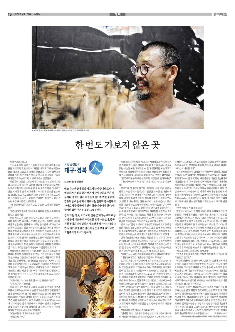 A “일필휘지의 속도감 있는 붓질로 인간의 깊은 고뇌와 철학을 담고 싶어요.” 예술은 인생이라는 긴 여정에서, 찰나의 순간에 저쪽 세계를 보는 거라고 사르트르가 말했다. 김 작가는 58살에 사르트르가 본 그 초월적 세계를 보았다. 좋은 건 누가 봐도 좋다. 예술의 경지에 이른 작품은 보는 사람으로 하여금 아름다움을 느끼게 한다. 환갑 이후로 그는 동서양의 융합적인 모습을 이룬 그림을 그릴 생각이다. 자크 데리다의 해체주의로 서구주의 이성적 방식을 해체하고, 자기만의 방식으로 다양한 시도를 해나갈 생각이라고. 김 작가는 2010년 북경아트사이드갤러리 초대전으로 북경과 인연을 맺고, 북경과 한국에 작업실을 두고 있다. 2014년 북경 화이트박스아트센터에서 왕충천(2013년 베니스비엔날레 감독, 북경중앙미술학원 교수) 기획으로 개인전을 개최하였고, 2016년 포항시립미술관에서 개인전을 했고, 2018년 한국문화관광부 후원으로 송좡당대문헌미술관에서 전관 전시를 했다. 2020년 창원조각비엔날레 본 전시에서 해체주의적 조각을 선보였고, 2020년도 2021년 제11회 한국미술평론가협회 작가상을 받았다. /글 장정옥 소설가 (1997년 매일신문 신춘문예로 등단. 2019년 김만중문학상 수상).