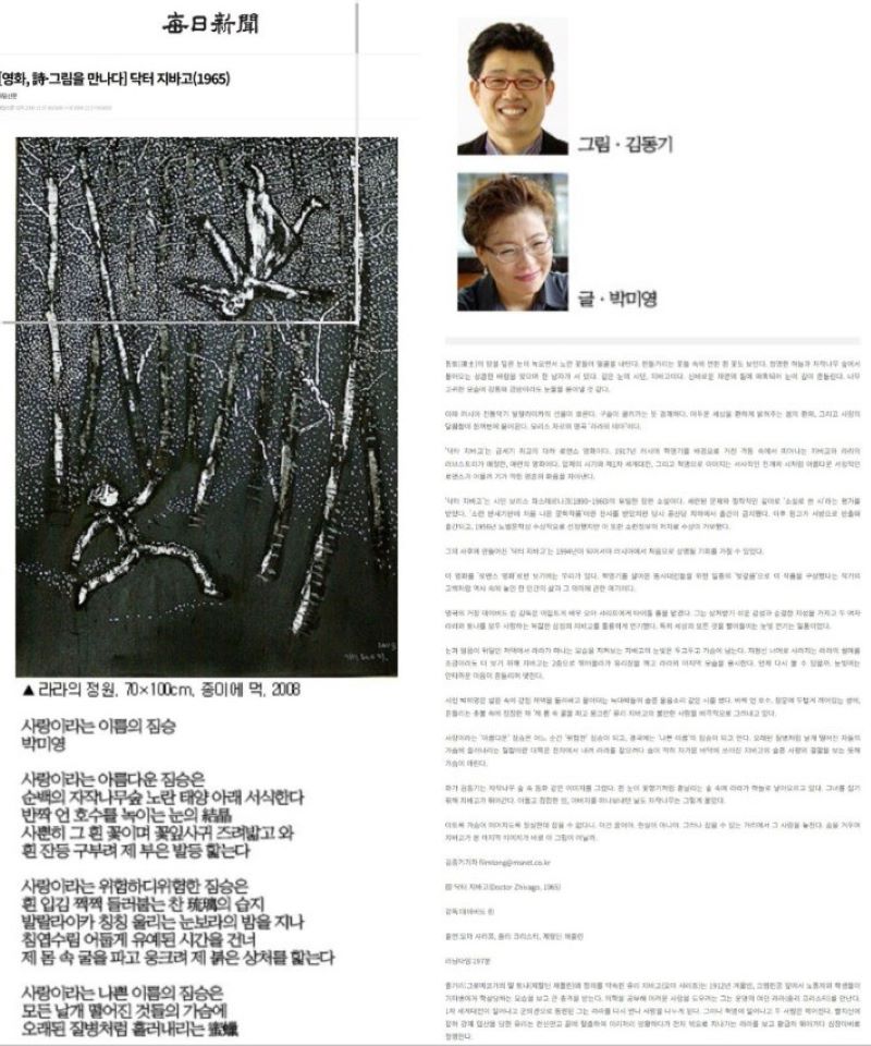 화가 김동기는 자작나무 숲 속 동화 같은 이미지를 그렸다. 흰 눈이 꽃향기처럼 흩날리는 숲 속에 라라가 하늘로 날아오르고 있다. 그녀를 잡기 위해 지바고가 뛰어간다. 어둡고 캄캄한 밤, 아버지를 떠나보내던 날도 자작나무는 그렇게 울었다.