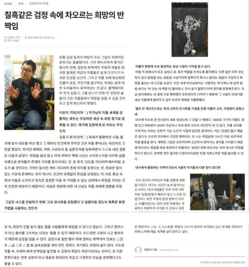 온통 검정 일색의 바탕이 주는 그림의 지배적인 분위기는 음울함이다. 거친 붓터치하며 찢겨진 종이의 잔해, 검정과 회백색의 무채색 계열로 최대한 절제된 색감의 작품들은 쉽게 다가가기 어려운 인상을 남긴다. 그리고 작품 속에 형상화된 인물의 표정, 무언가를 갈구하는 자세는 삶에 대한 두려움까지 새겨져있는 것 같다. 블랙페이퍼의 작가 김동기, 그를 만나기 전엔 이 ‘찬란한 슬픔’이 깃든 작품들에서 희망을 읽을 수 있을 것이라고 감히 확신하지 못했다.