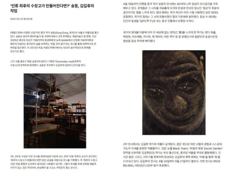 | [2014.03.31] 2014 ‘인류 최후의 수장고가 만들어진다면?‘ 송동, 김길후의 작업-헤럴드경제 |